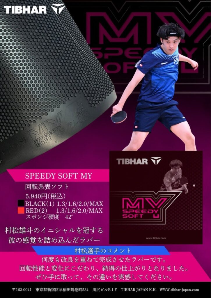 村松選手のイニシャルが商品名になり、松平健太選手のハイブリッドMKに続き、2枚目のイニシャル入りラバーです!