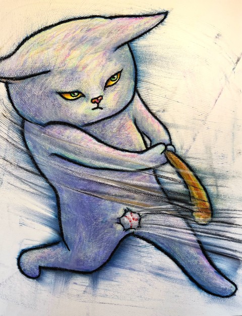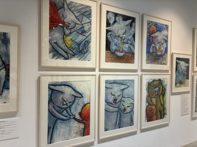 どれもこれも笑っちゃう作品ですが、よく見ると何重にも色が重なり合ってキラキラしていたり、繊細なタッチで描かれている作品なのだと驚かされます。