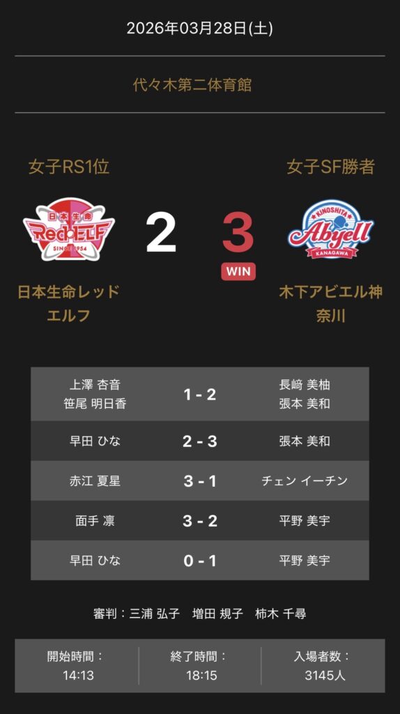 先週行われていた、Tリーグの女子ファイナルの試合を観に行ってきました!